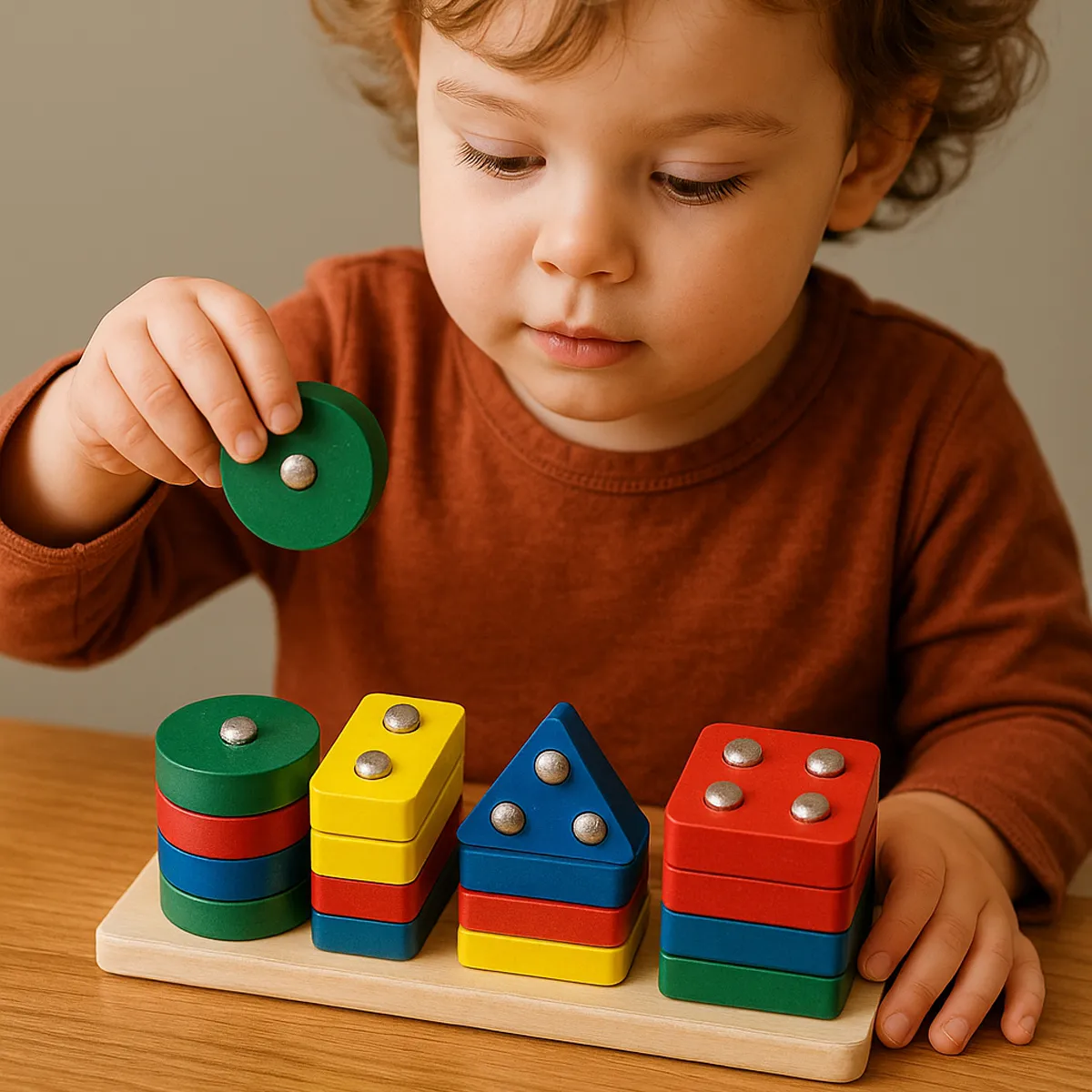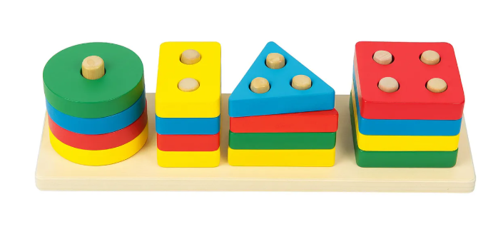 Com peças coloridas e em diferentes formatos, a criança aprende a reconhecer formas, cores e tamanhos enquanto trabalha coordenação motora fina e raciocínio lógico.