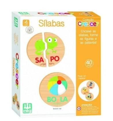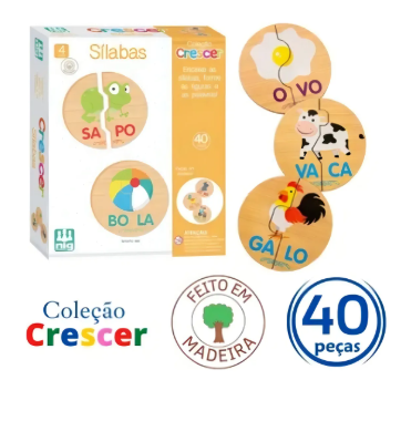 Com 40 peças coloridas e resistentes, o jogo incentiva a identificação de sílabas, a formação de palavras e o desenvolvimento da consciência fonológica.