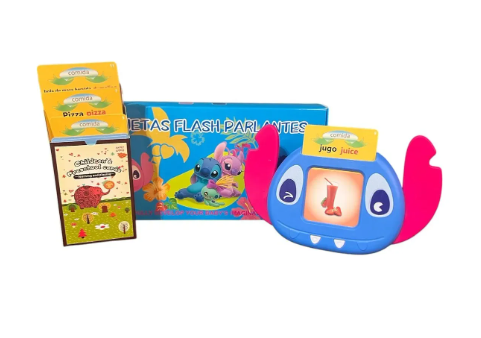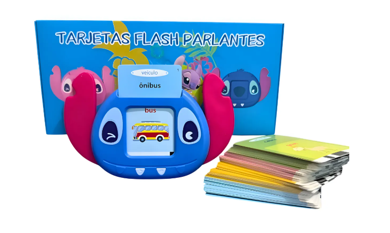 Com design inspirado no personagem Stitch, o mini console possui leitor de cartões bilíngue (português/inglês), permitindo que a criança aprenda palavras, números, sons e frases enquanto brinca.