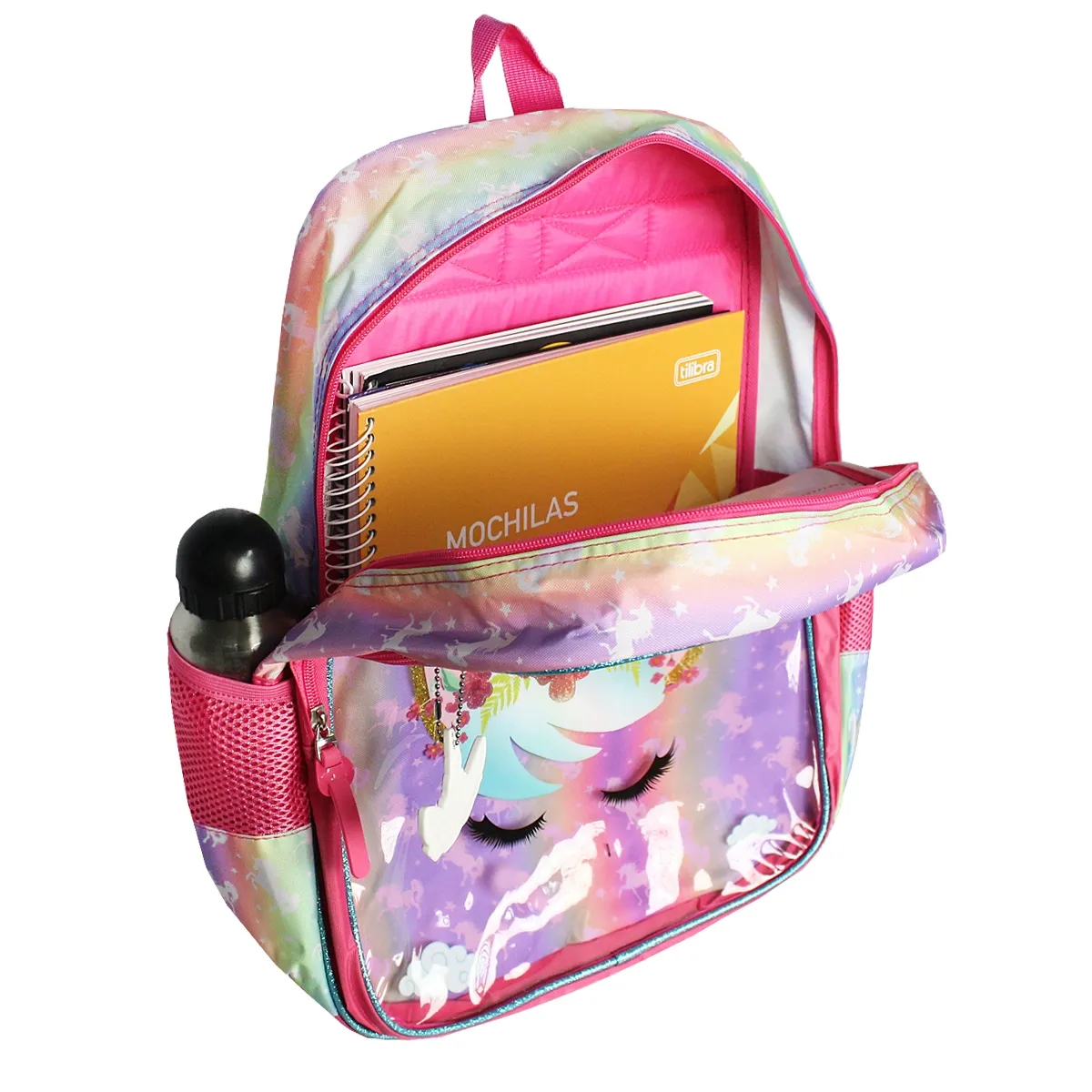 Com design encantador de unicórnio em tons de lilás, ela transforma a rotina escolar em um momento ainda mais especial.
